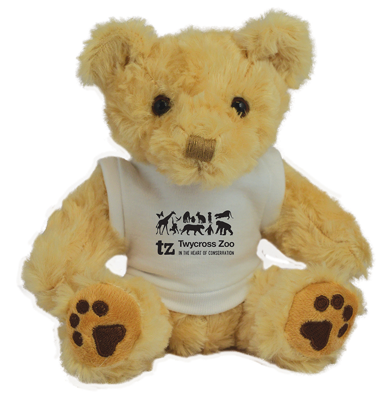 7inch bear. Soft light brown fabric padded with polyester beans. includes T-shirt with a one colour print.