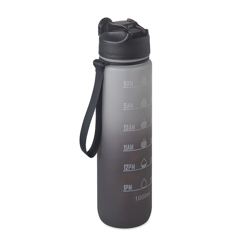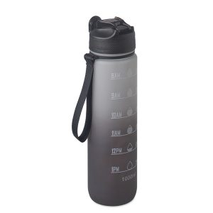 Sports water bottle in RPET with integrated straw, soft silicone mouthpiece, motivational time markings, one hand opening flip top lid, safety lock and carrying strap. Capacity 1L.