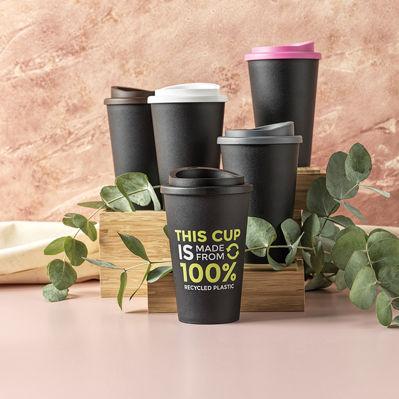 UK Made Double-walled tumbler made from recycled plastic, with a twist-on lid. The tumbler is 75% recycled in total, with a recycled mug with black inner layer, and a standard lid. Due to the nature of recycled plastic, there may be small marks or some colour variation. The tumbler has a volume capacity of 350 ml and is fully recyclable. Made in the UK. Packed in home compostable bag. BPA-free. Recycled PP Plastic, PP Plastic.