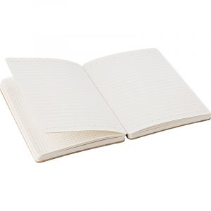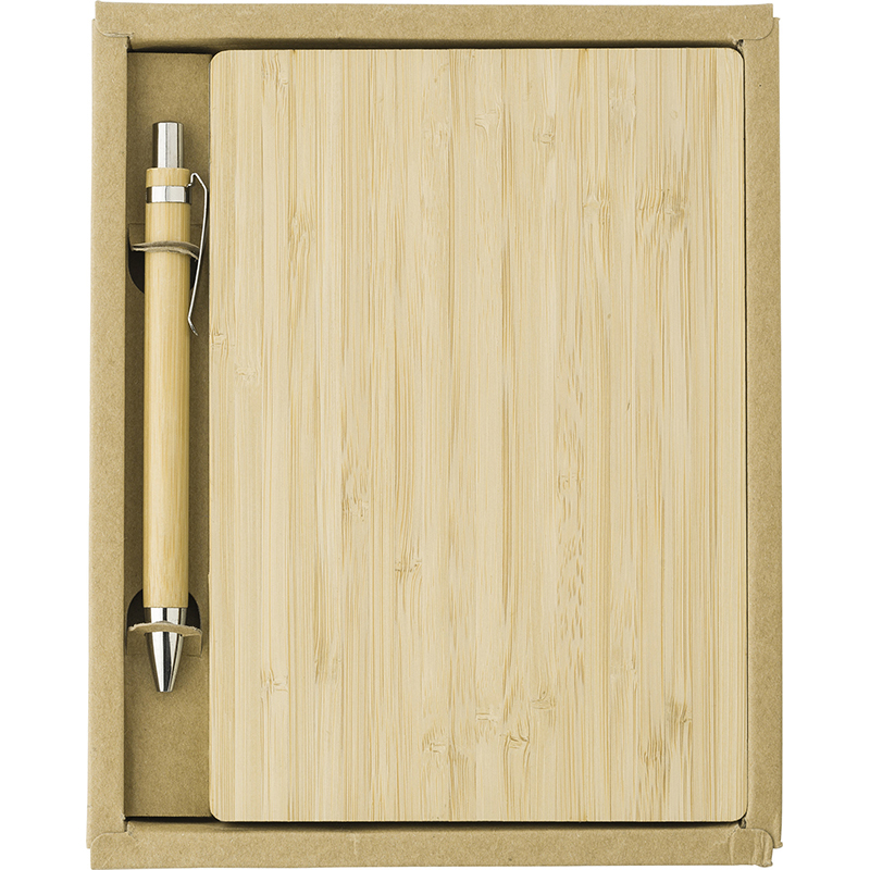 Bamboo cover notebook, packaged in a brown craft paper box with plastic sleeve. Including bamboo pen 3804. The notebook has 128 sheets of lined paper with date notification and page numbers.