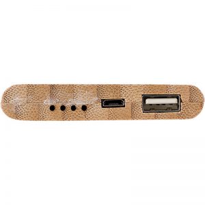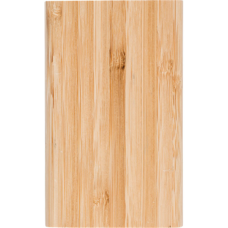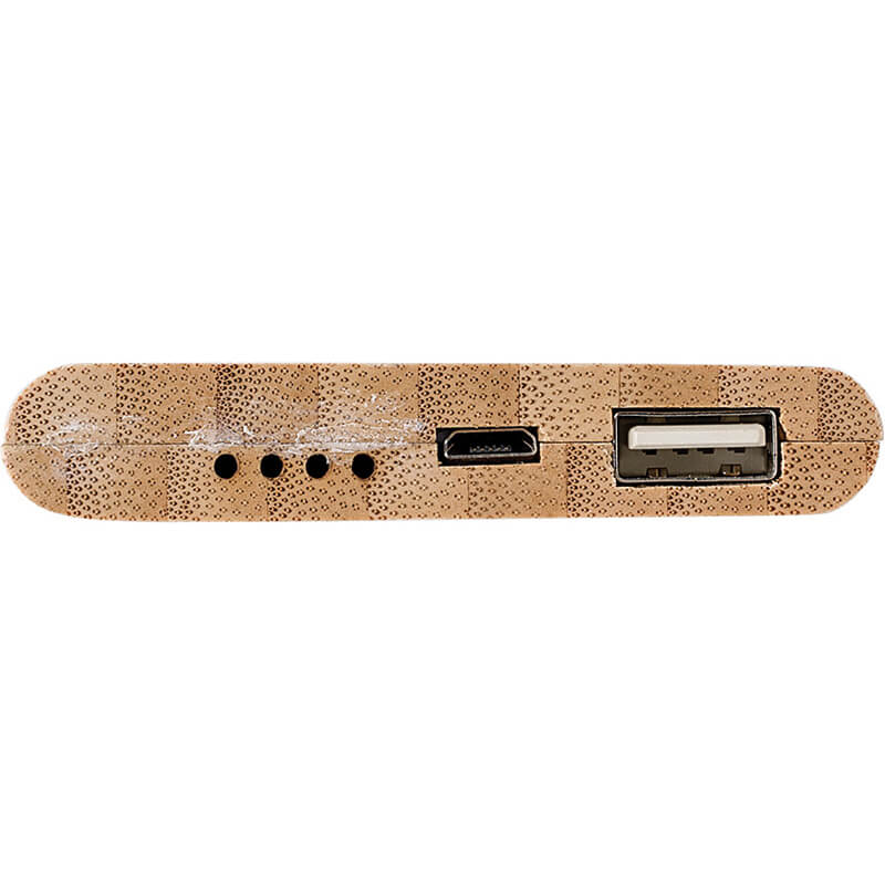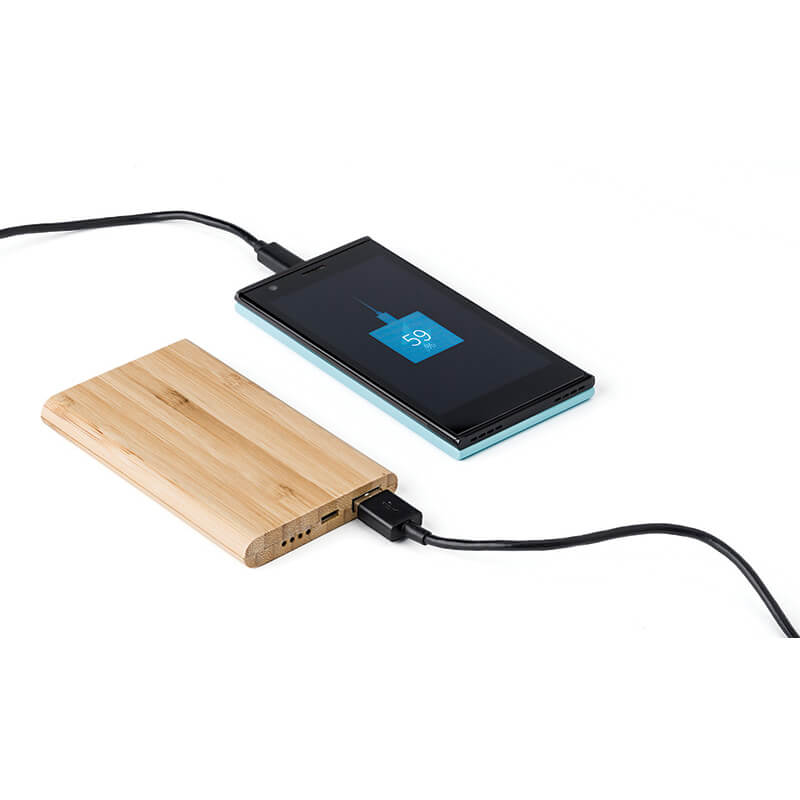 Bamboo power bank with a capacity of 4.000 mAh. Input DC5V/1A. Output DC5V/1A. 3.7 V li-polymer battery. Two USB ports and LED indicators. Includes charging cable (USB – USB-C).