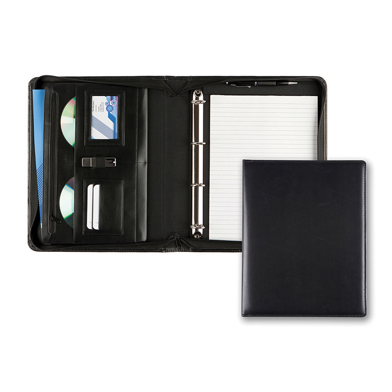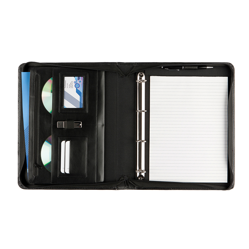 Belluno soft touch leather look zipped ring binder with multi pocket function. Padded cover with black interior pockets. Includes a 2 or 4 ring mechanism, lined pad & a one position deboss, screen or full colour print available.