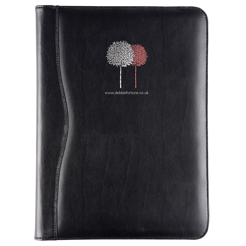 A4 Zipped conference folder with a lightly padded and stitched cover. Finished in a Balmoral bonded leather formed from recycled leather waste bonded to form a soft material with an excellent emboss quality and a smooth grain. Supplied boxed.
