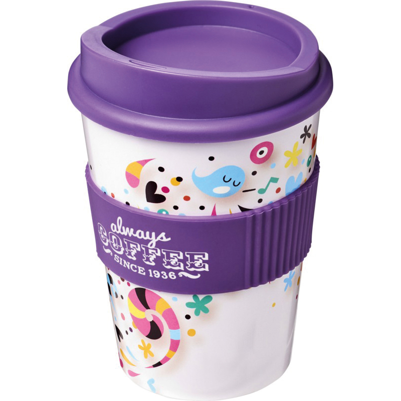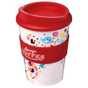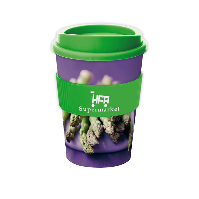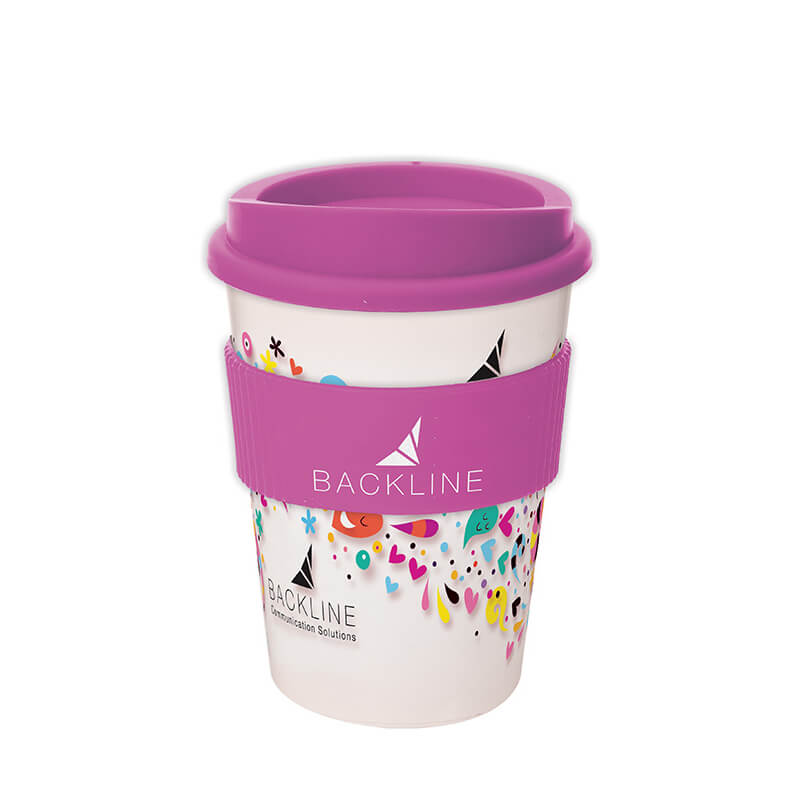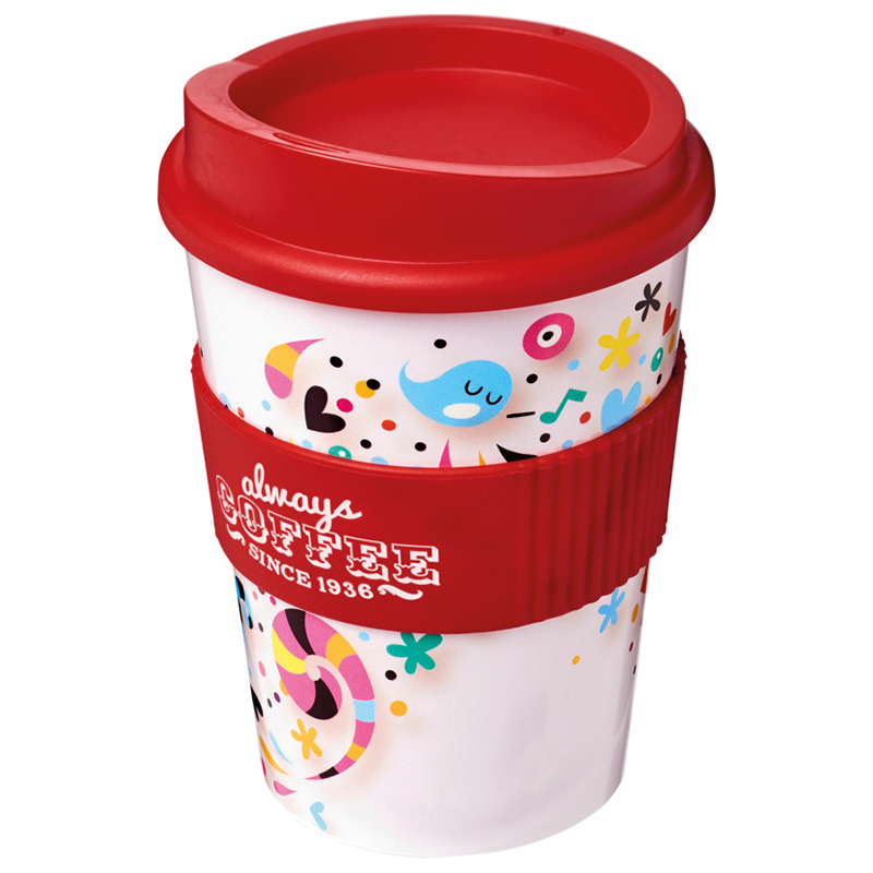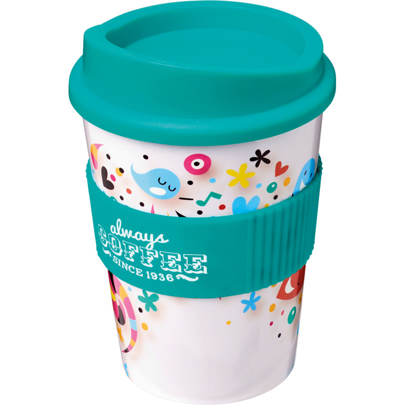 Single-wall tumbler with press-on lid and silicone grip. Tumbler features a full colour wraparound design moulded to the product making it long-lasting and durable. EN12875-1 compliant dishwasher safe and microwave safe. Volume capacity is 300 ml. Mix and match colours to create your perfect mug. Made in the UK.