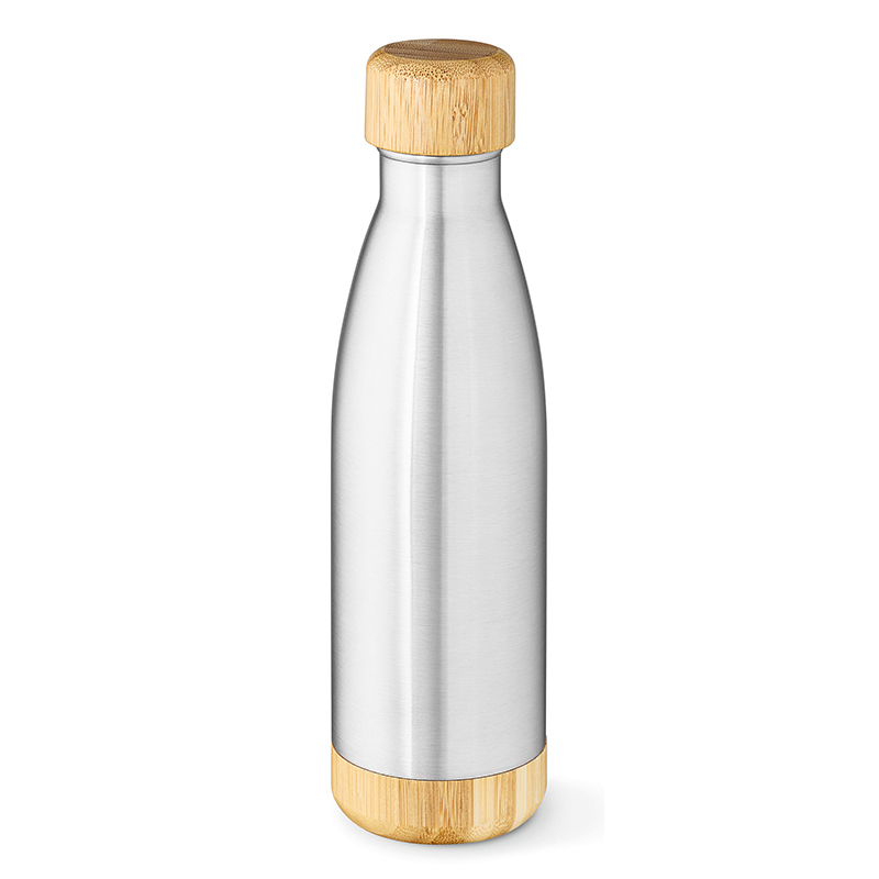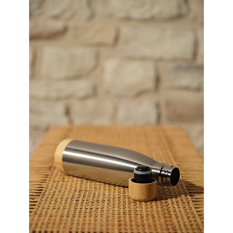 800ml (750ml net) recycled stainless steel water bottle with bamboo lid and base. The double-walled insulation keeps your drinks cold all day long. Packed in an individual cardboard box.
