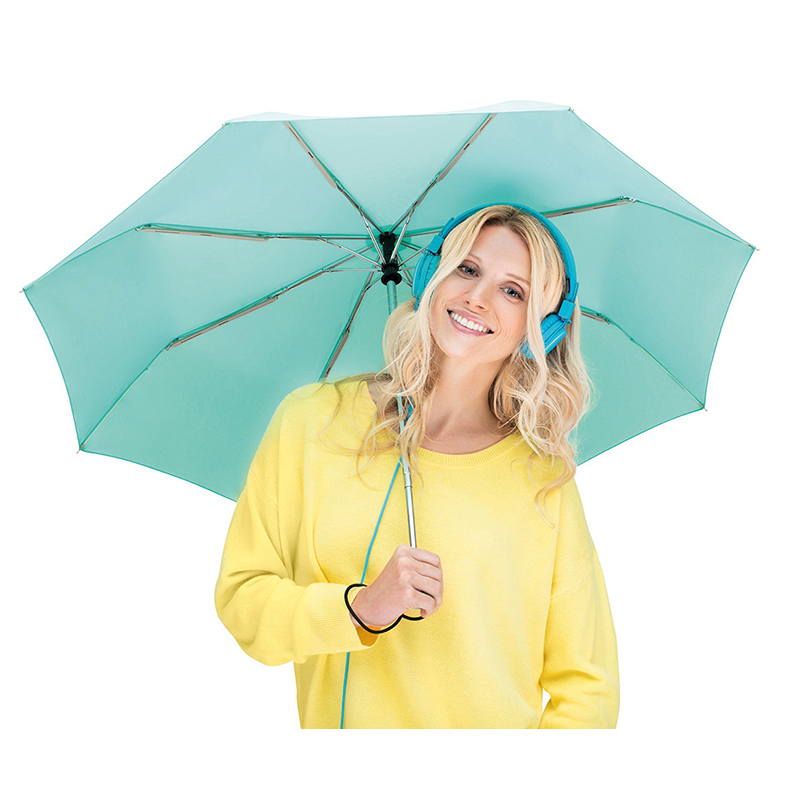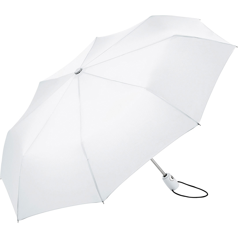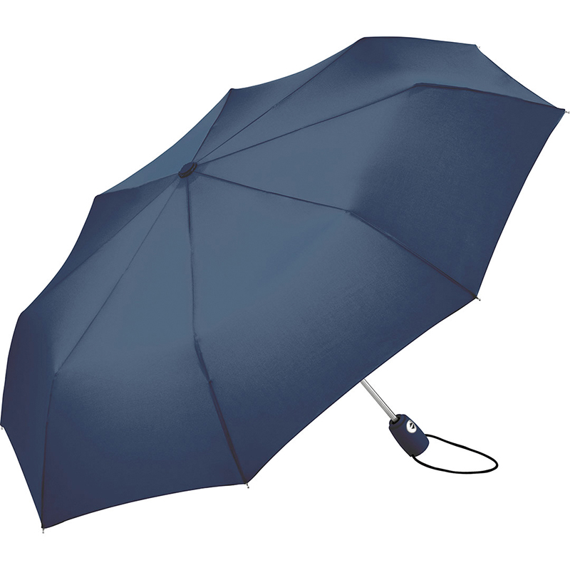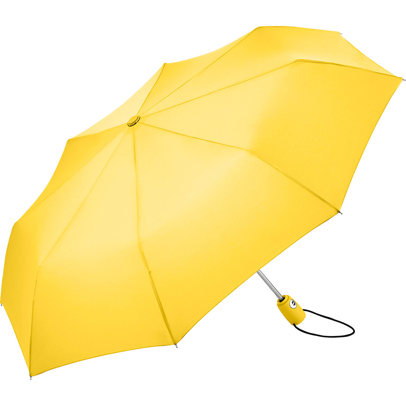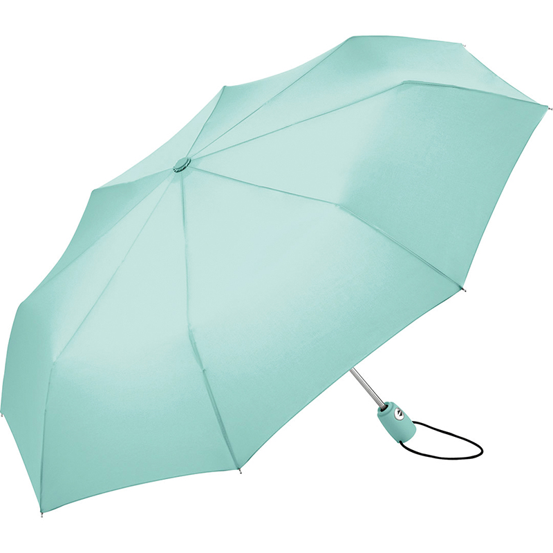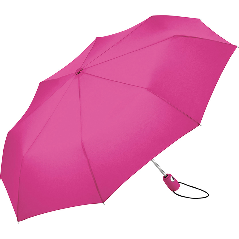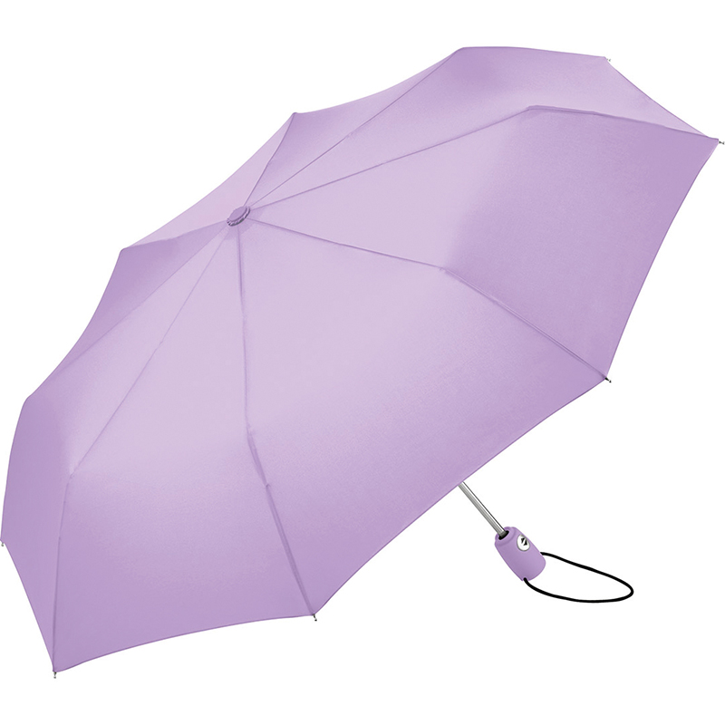Trendy automatic open and close mini umbrella in solid colouring. Convenient automatic function for quick opening and closing. high quality windproof system for maximum frame flexibility in stormy conditions. Soft – Touch handle in colour matching cover with silver push – button. Elastic loop and promotional labelling option. Includes sleeve with black piping.