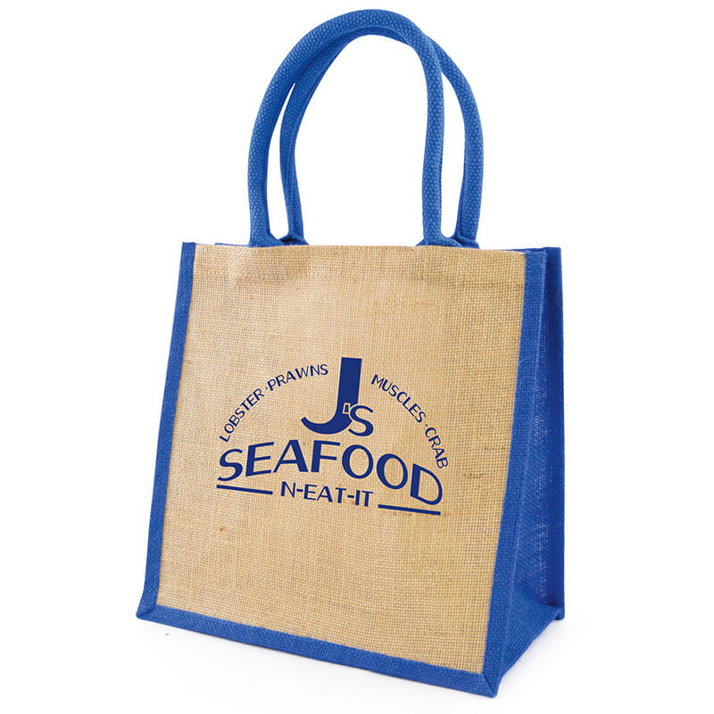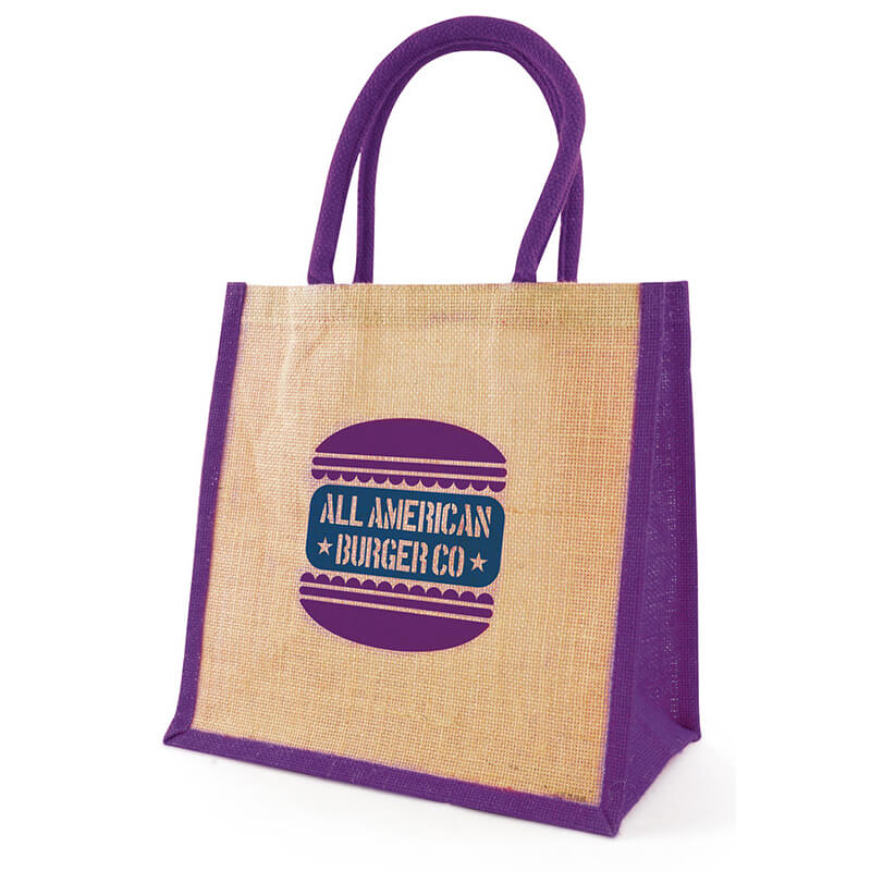 A compact medium sized natural eco – friendly jute bag with natural or coloured gussets. Large branding area to show off your logo. Features include a rope handles and laminated backing. Size 30 x 30 x 16cms.