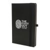 Eco A5 notebook, cover is made from corn starch and bamboo fibre to produce a ‘leather effect’ eco PU fabric cover over recycled board. Contains 96 sheets of 70g lined recycled paper, ribbon page marker, RPET elastic closure and pen loop.