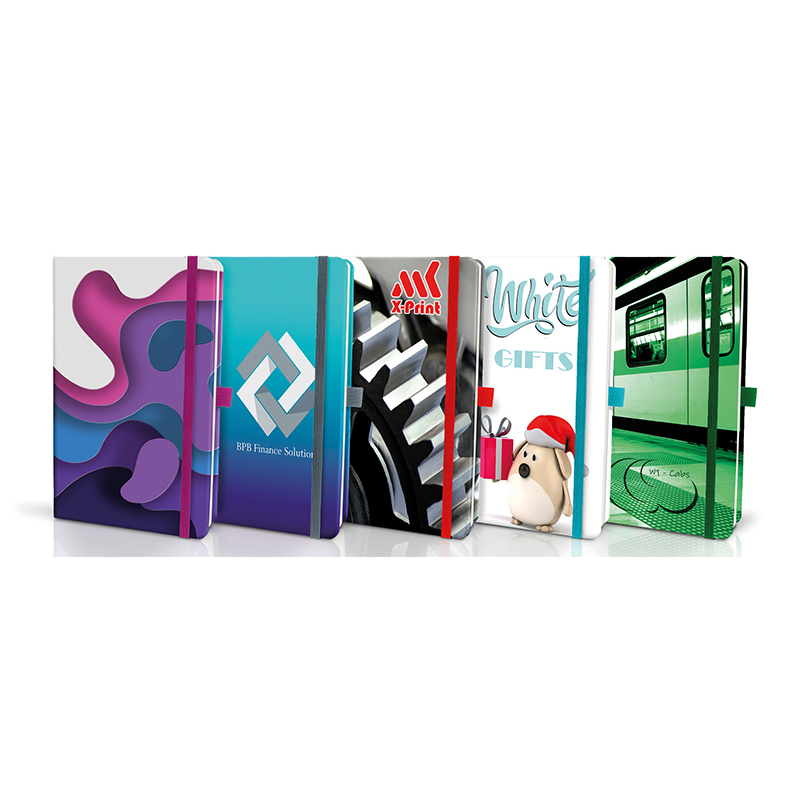 Infusion is a fully bespoke range of notebooks, as standard this hard backed notebook is supplied with a CMYK printed cover with soft touch lamination and comes with a note pad with 112 ivory lined sheets, ribbon, pen loop, elastic, individual shrink wrap packaging and delivery to 1 mainland UK address. Other personalisation options include: bespoke printed pages throughout, tip-in pages, belly bands, coloured page edges, pocket, and printed sleeves.
