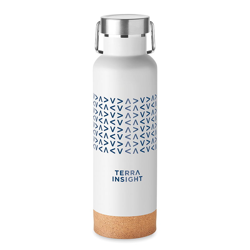 Double wall vacuum insulated flask in recycled stainless steel, the lid has a carry handle and a cork detail base (90% recycled stainless and 10% stainless steel). Leak-free. Capacity: 500 ml.