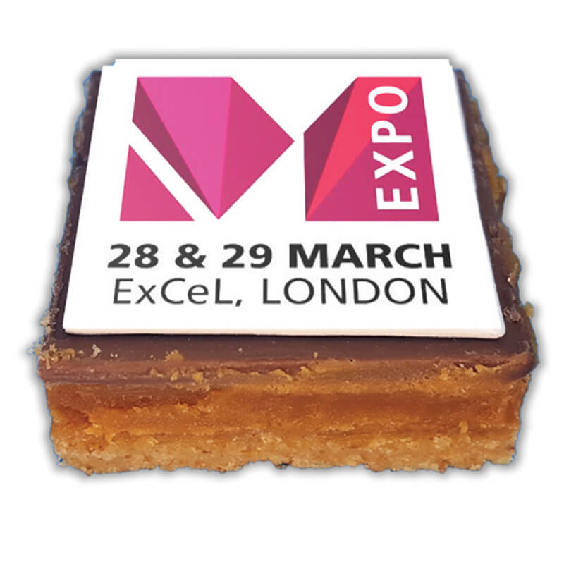 Delicious 5cm logo Millionaire Shortcake. Individually wrapped in clear biodegradable film and printed with an edible logo image.