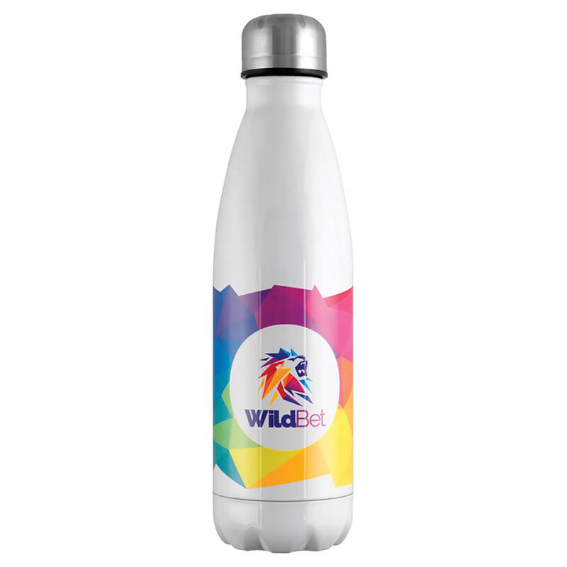Gloss white 500ml bottle made from 304 stainless steel, available with dye sublimation printing. Keeps cold drinks for 24 hours and hot drinks for 12 hours. Individually boxed. Part of the Mood® Collection.