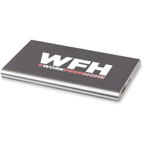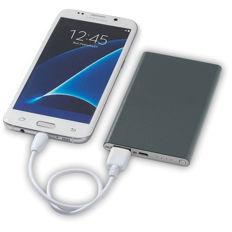 4000 mAh slim, lightweight aluminium power bank with grade A lithium polymer battery. The LED indicator lights up during charging and displays the remaining battery capacity in the power bank. Power bank’s input is 5V/1A and output is 5V/1A. Includes a USB-A to Type-C charging cable. Supplied in a blank white gift box. Aluminium.
