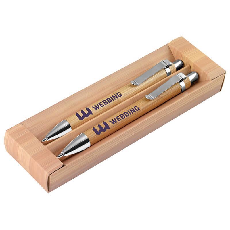 Bamboo-themed cardboard presentation box containing a hand-machined bamboo ballpen and mechanical pencil.