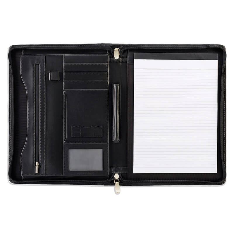 Zipped A4 Conference pad holder with a lightly padded and stitched cover. Multi pocket interior. Finished in high quality Sandringham soft black nappa leather with a full natural grain. Supplied in a black presentation lid box.