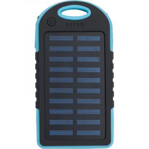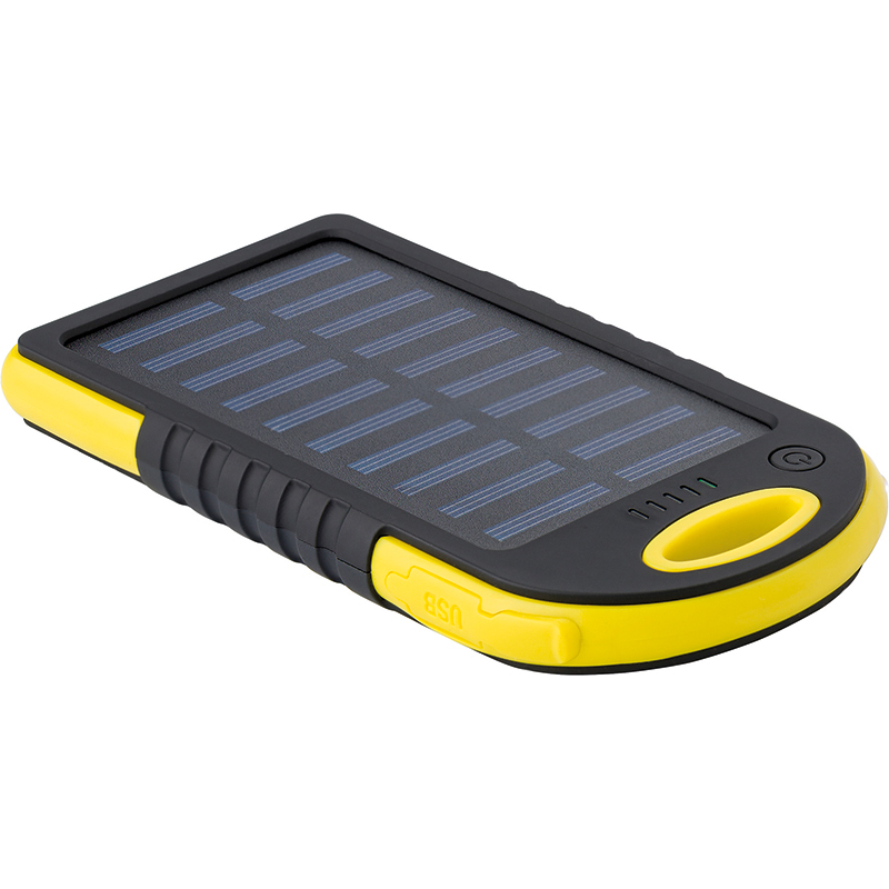 Solar power bank with rubberized trim with green indicator light and flashlight on the side. Supplied with two USB ports and a micro USB port. Solar charging 5V/200mA. Input DC5V/1A. Output DC5V/2x1A. Capacity 4.000mAh. Includes USB cable