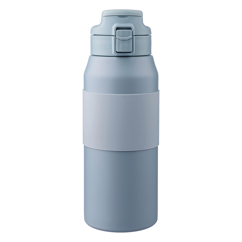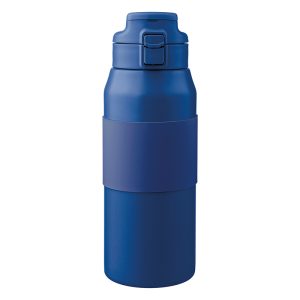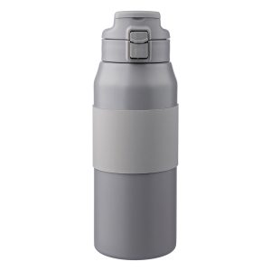 Stainless steel double walled drinking bottle with a silicone grip, straw, and carrying handle. Keeps contents hot for 8 hours and cold for 12 hours. Individually packaged in a brown cardboard box.