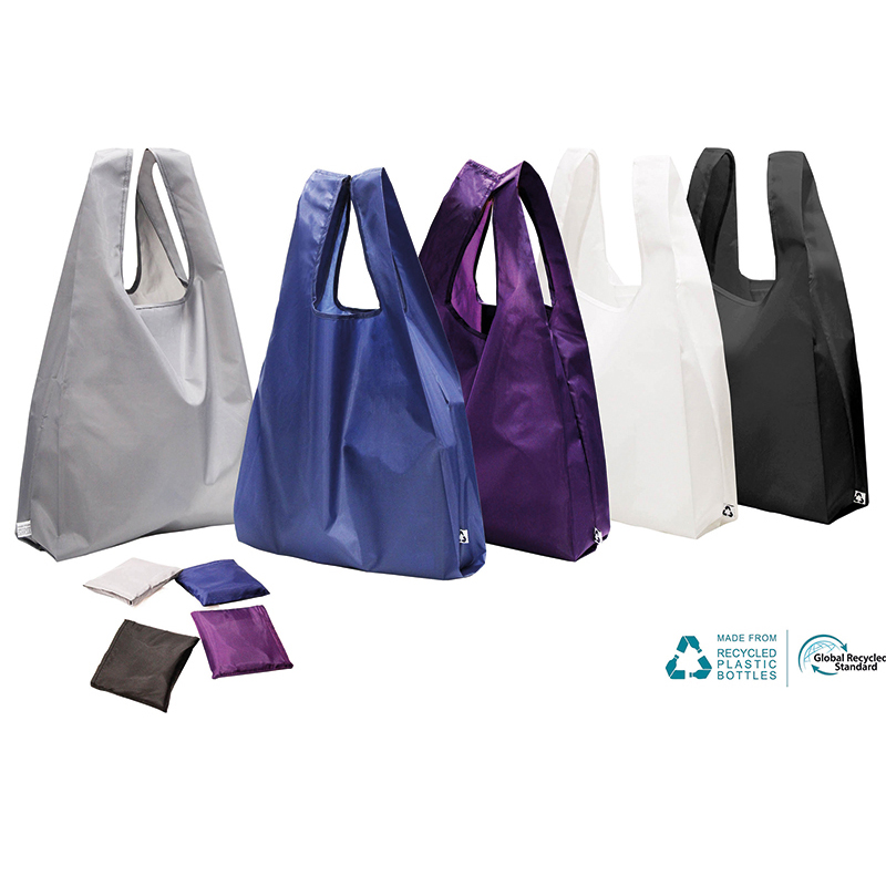 190T foldable rPET bag with side gusset, inner pocket and vest style handles. GRS certified.