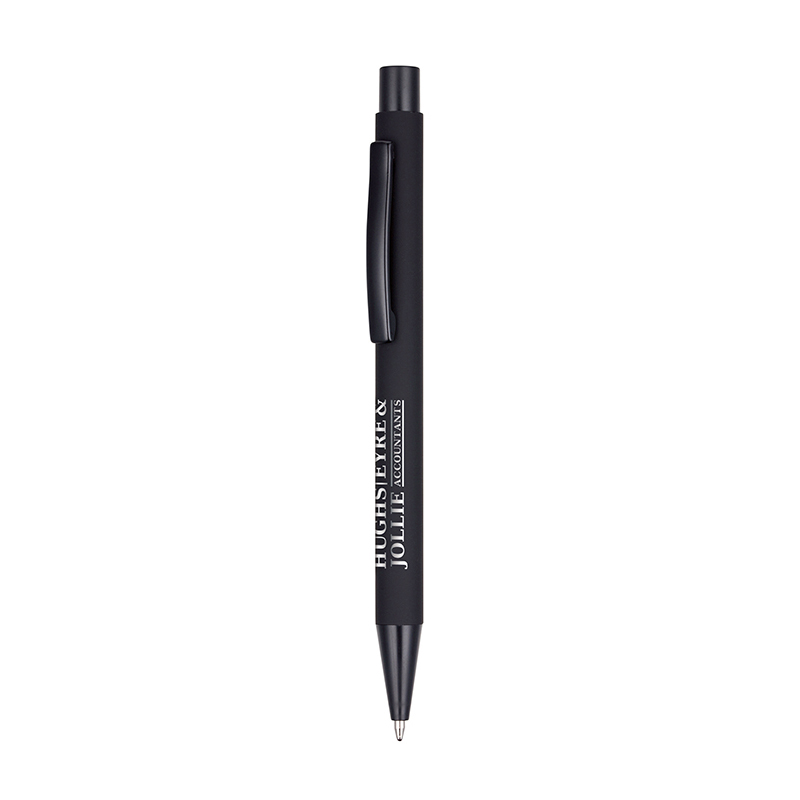 A super sleek all black version of the new soft feel Travis ball pen. The chrome engraving stands out beautifully on this surface! Available on its own or as part of a set.