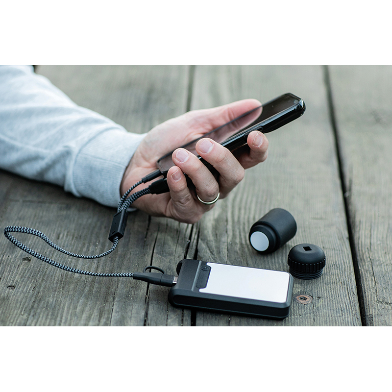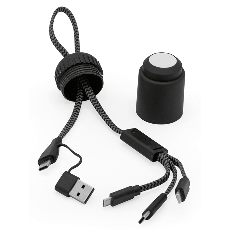 versa cord 5-in-1 cable tidy made from braided rPET and recycled ABS. A sleek, portable pocket-sized powerhouse featuring the following connectors: two USB-C, one USB-A, one Micro USB, and one iOs-compatible cable, all neatly wrapped in a stylish tube. The Versacord keeps your connectors organised, protected from damage and always within reach.