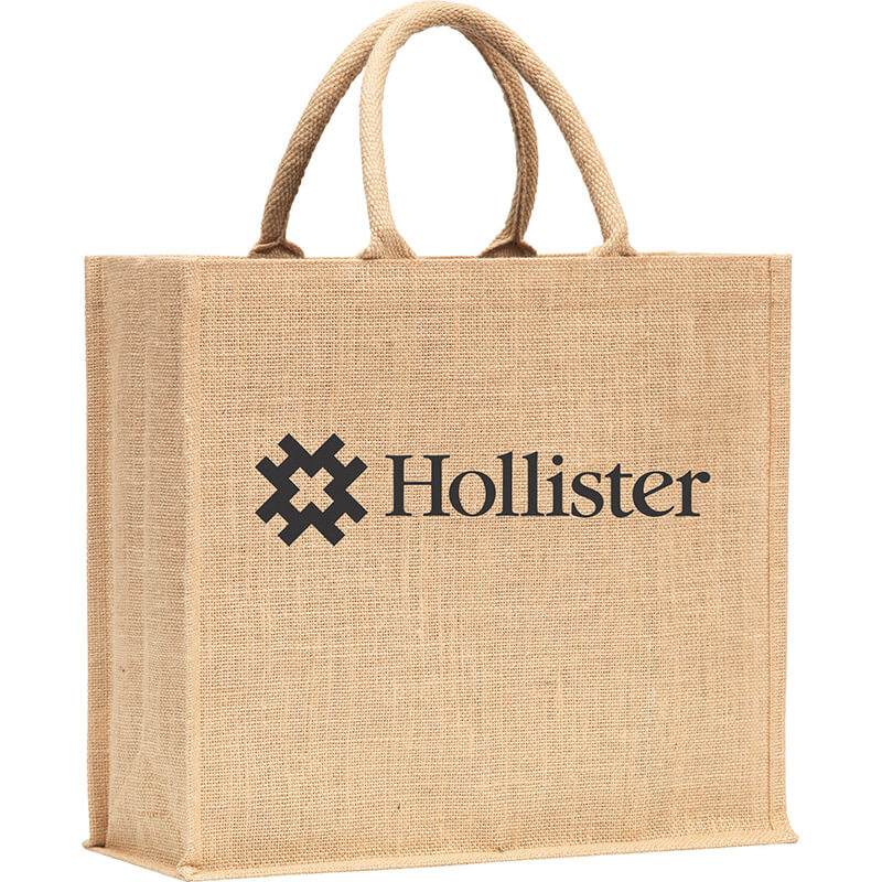 Environmentally friendly tote shopper bag made from 14 x 15 Natural Jute with LDPE backing for extra structure and 40cm natural colured cotton webbing rope handles. Size 35 x 39 x 15cms.