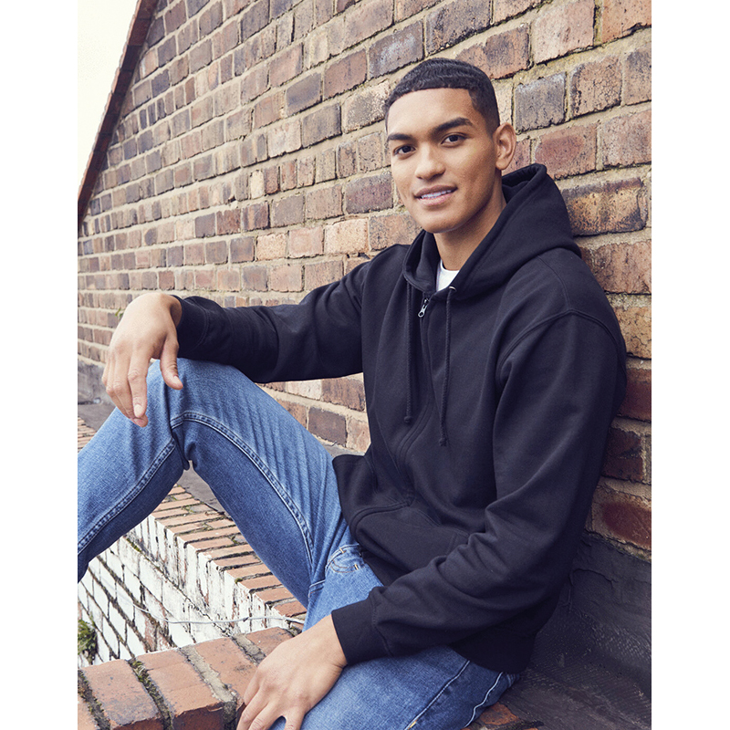 80% Cotton, 20% Polyester, 280gsm. Full zip sweat. Brushed inner fleece. Double fabric hood and self coloured cords. Ribbed cuffs and hem.